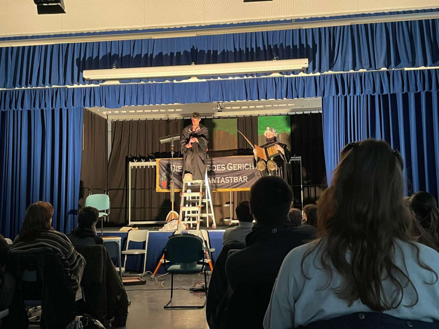 Unumstritten gehört auch Heinrich von Kleists Lustspiel von 1808 zu den Klassikern der Literatur. Und dass dieser keineswegs verstaubt sein muss, zeigte am Montag, 09.02.26 das „überall-Theater“ in einer unterhaltsamen wie überraschend interaktiven, reduzierten Adaption. Das Tournee- Ensemble mit Sitz in Wien, bestehend aus 3 professionellen Darstellerinnen und Darstellern, agierte von Beginn an nicht für, sondern mit seinem Publikum. So wurde die Figur des Ruprecht Tümpel kurzerhand zu Paul (dem Authentischen) und Eve Rull zu Sophie (perfekte Besetzung!). Der Jahrgang 12 fand sich in der Rolle des Gerichtspublikums und Requisitenbeauftragten wieder und übernahm am Ende des Stücks sogar die Rolle des Dramaturgen. Die angehenden Abiturienten entschieden über das Schicksal des korrupten Dorfrichters Adam bzw. des zu Unrecht beschuldigten Verlobten Ruprecht. Ihn in den Krieg zu schicken, mit dem die Schauspieler den Stoff in die Gegenwart der sogenannten „russischen Militäroperation“ holten, wagte letztlich kaum jemand.