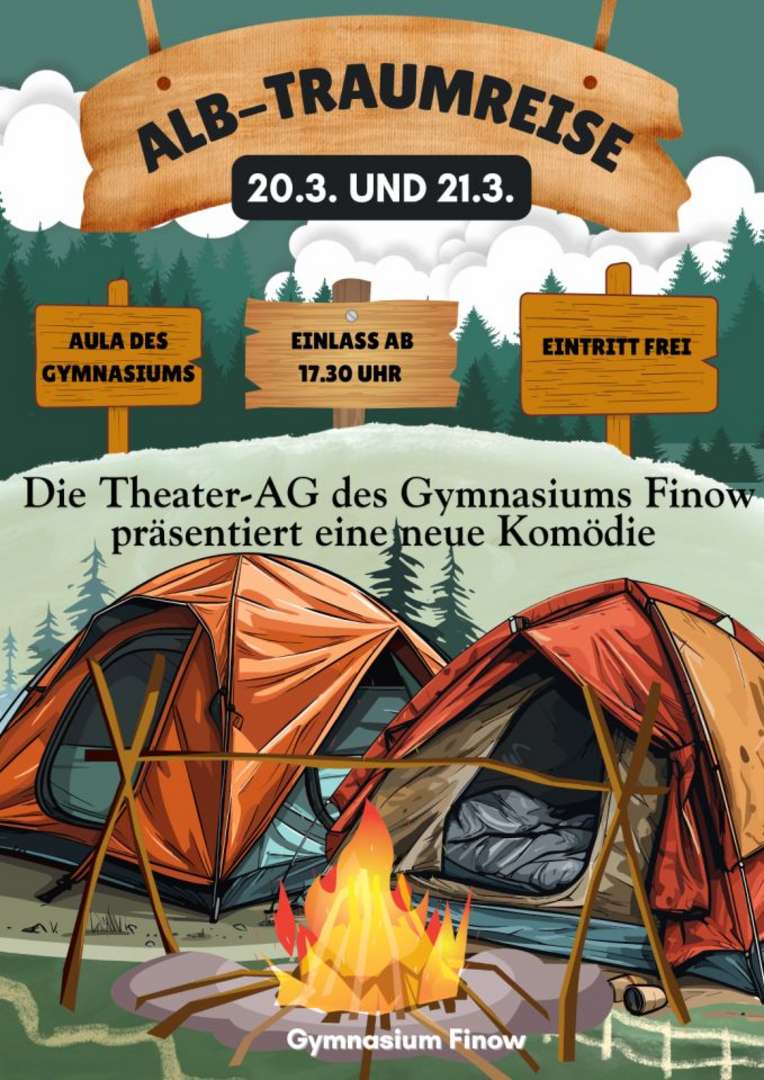 unsere Theater-AG lädt Sie wieder zu einem lustigen, unterhaltsamen Abend ins Gymnasium Finow ein. Wir lieben es zu lachen, wir lieben positive und stimmungsvolle Stücke. Deswegen präsentieren wir Ihnen wieder eine Komödie, diesmal mit dem Titel (Alp-)Traumreise. Es geht um eine bunte reiselustige Gruppe, die sich auf den Gewinn einer vermeintlich teuren Spa-Urlaubsreise freut, sich am Ende jedoch in Zelten in der Walachei wiederfindet. Wie es dazu kam, erfahren Sie am 20.3. und 21.3., um jeweils 17.30 Uhr, in der Aula der Schule. Der Eintritt ist kostenlos.