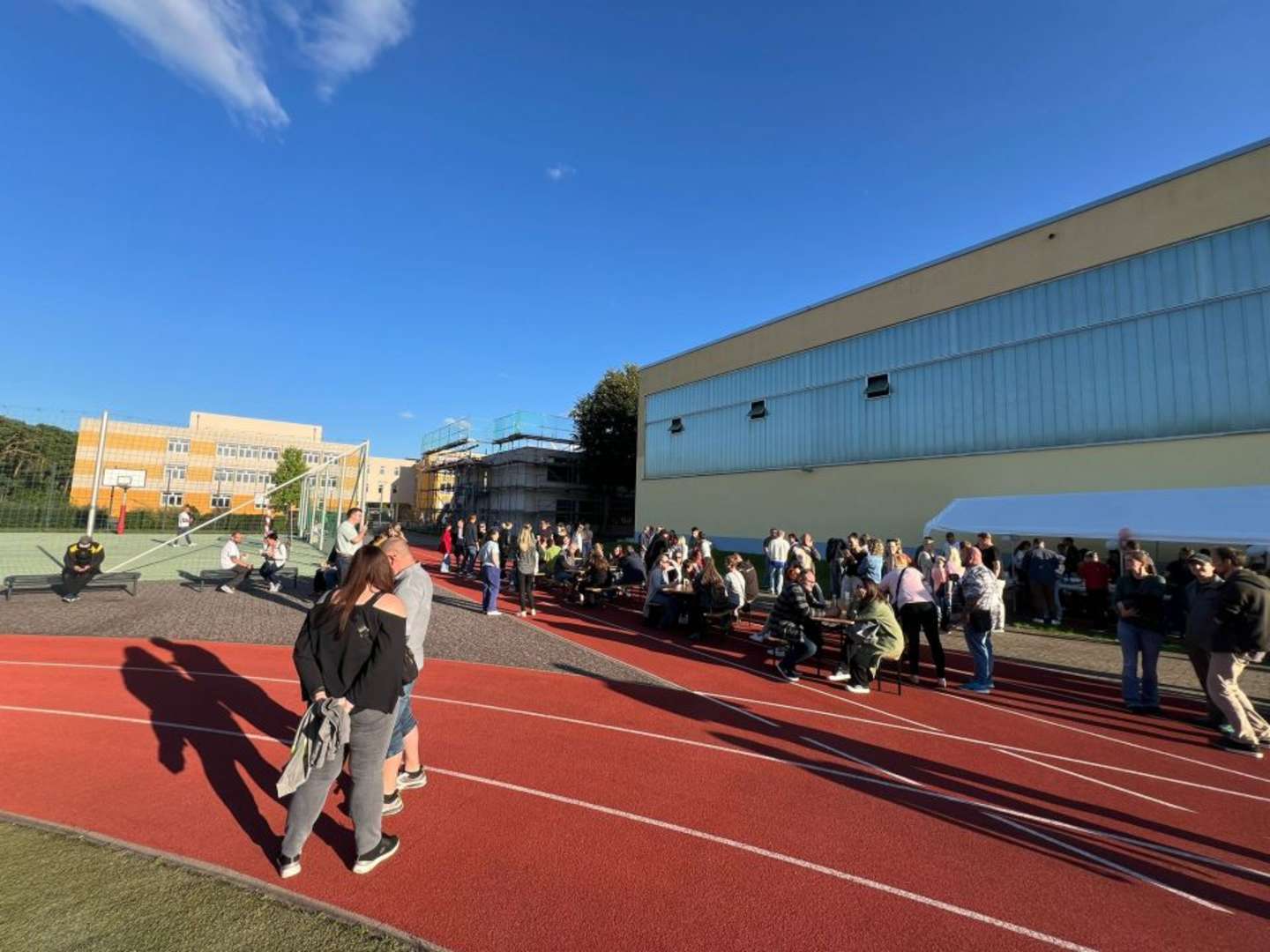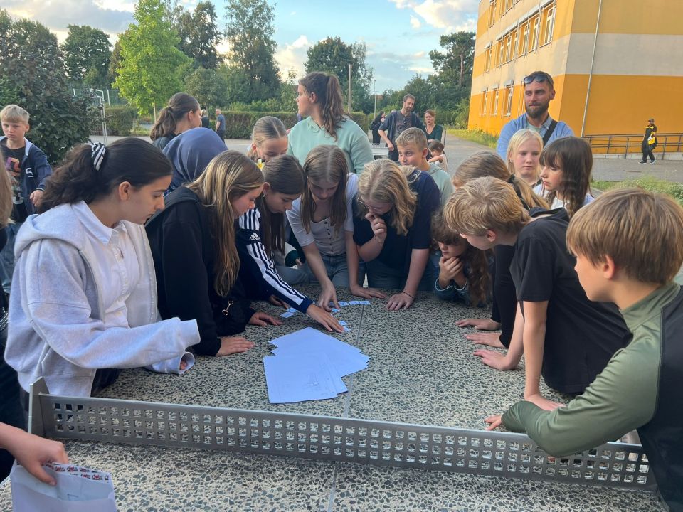 Damit dies optimal gelingt, lernten die Schülerinnen und Schüler die Räumlichkeiten ihrer neuen Bildungsstätte bei einer Schnipseljagd intensiver kennen, um am Ende ihre eigenen Schul-T-Shirts überreicht zu bekommen. Bewegung macht hungrig – auch dafür wurde mit einem Catering gesorgt. Von den Eltern wurde dies ebenso gern angenommen, um dabei miteinander und mit den Lehrkräften ins Gespräch zu kommen. Wo gelingt das Kennenlernen der Jugendlichen besser als beim gemeinsamen Sport und Spiel – dazu hatten sie am Ende des gelungenen Nachmittags die Gelegenheit.